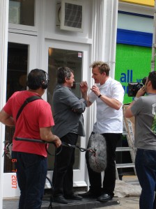 My first encounter with “fame” happened on the last day of my month-long trip to Italy an England with my cousin, Frances, back in 2007.  We had been in Brighton for a couple of days, getting tired of the constant rain and howling winds on the water (Brighton is a popular sea-side holiday destination for the Brits).  We had pretty much lost all interest in doing any more sight-seeing and were just passing time after lunch before driving back to Heathrow to return home.  So we wandered around the shops for some last-minute shopping when we came upon a small film crew.  We had just walked past them when I suggested to Frances that we go back and find out what was happening.  She was walking slightly ahead of me at this stage and it did not take long before she turned around, grabbed my arm, and said excitedly “It’s Gordon Ramsay!”  Sure enough, within seconds, the man himself came out from the restaurant we had just passed and stood on the footpath arguing with the owner.  It turned out he was filming Ramsay’s Kitchen Nightmares.  We loitered for a short while, observing the scene from across the narrow two-lane street with great amusement.  We had not even realised we were in a background shot until that episode aired in Australia about eight months later.  Within minutes of that episode airing, I was sent the above picture of the scene where I was spotted by one of my friends.